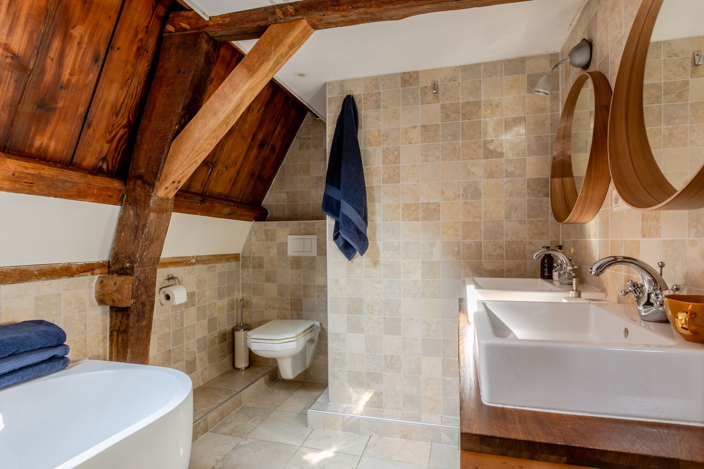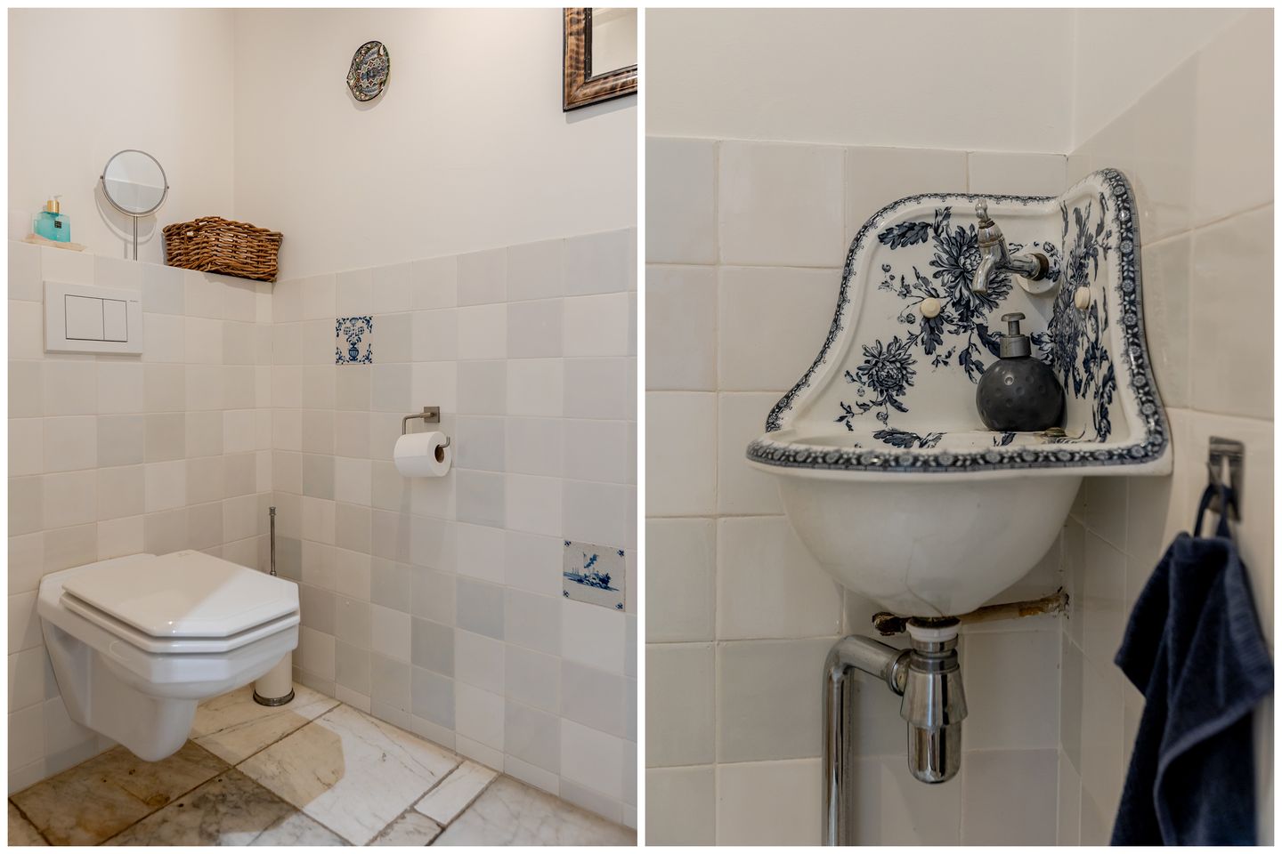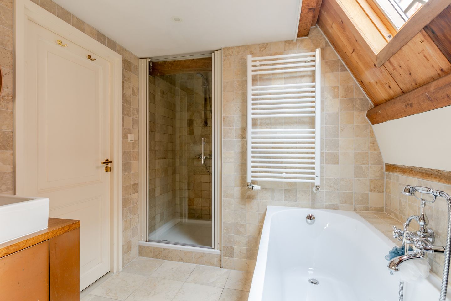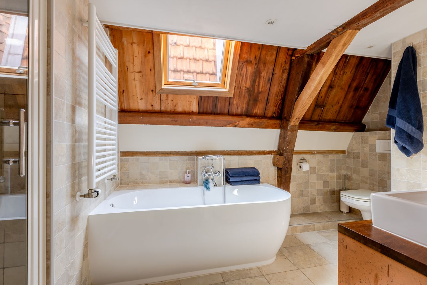 De stijlvolle badkamer is afgewerkt met exclusieve Italiaanse designtegels en voorzien van alle luxe: een ligbad met handdouche, een modern hangend toilet, een ruime douchecabine, een dubbel wastafelmeubel en een designradiator. Het dakraam zorgt voor een prettige lichtinval en natuurlijke ventilatie – een heerlijke plek om te ontspannen.
