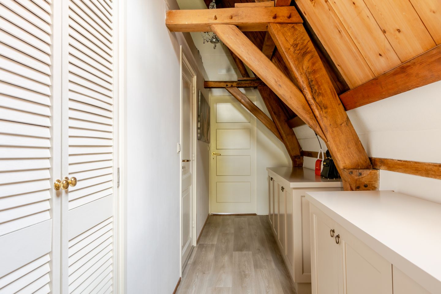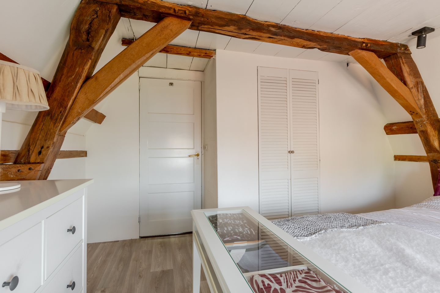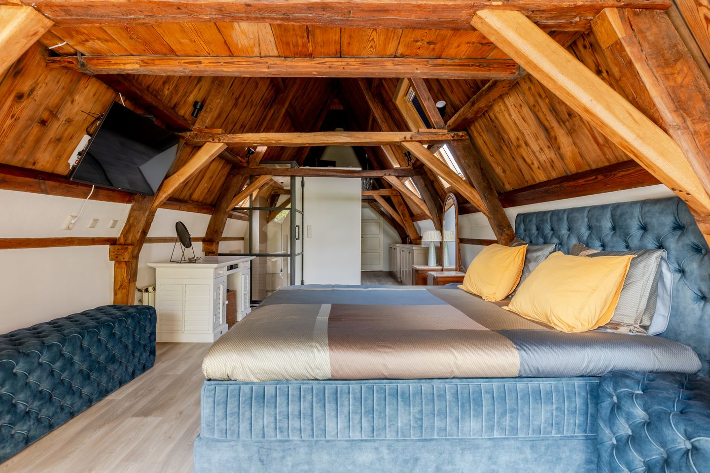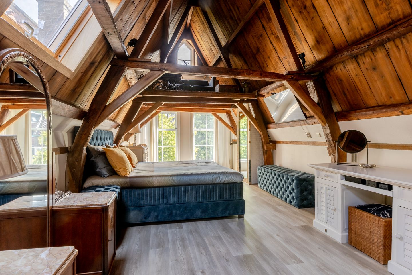 Via de stoere zwarte stalen pui bereikt u de indrukwekkende master bedroom aan de voorzijde van de woning, een echte eyecatcher! De originele kapconstructie met brede houten balken, meerdere dakramen en een nokhoogte van maar liefst ca. 4,45 meter geven de kamer een loft-achtige uitstraling. De sfeervolle koekoek (dakkapel) versterkt het ruimtelijke gevoel en zorgt voor extra lichtinval. Dankzij de riante afmetingen biedt deze kamer volop mogelijkheden – zo kan hier desgewenst eenvoudig een derde slaapkamer worden gecreëerd.